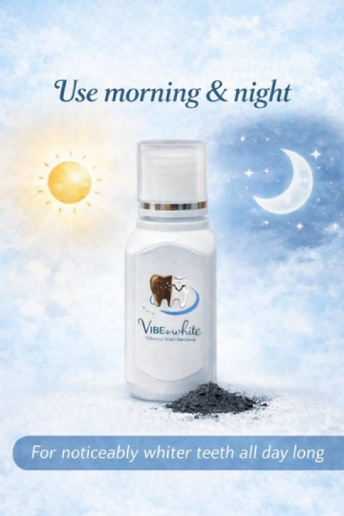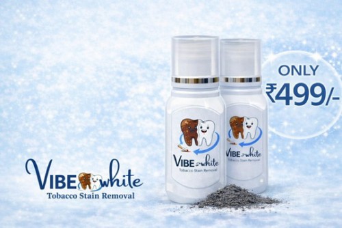 .VIBE WHITE – Charcoal Stain Care For Tobacco, Gutkha, Cigarette, Tea & Coffee Stains Product Overview Vibe White is a premium activated charcoal powder specially formulated to help reduce stains caused by tobacco, gutkha, cigarettes, tea, and coffee. With regular use, it helps improve the appearance of stained teeth and supports a cleaner, fresher-looking smile. Made with Ayurvedic Herbals 100% Activated Charcoal Ayurvedic herbal formulation Gentle on teeth and gums Free from harsh chemicals Key Benefits Helps reduce tobacco and gutkha stains Effective against tea, coffee & cigarette marks Promotes a cleaner, fresher look Noticeable improvement with regular use in up to 4 weeks Gentle care for stained teeth Results may vary from person to person. Directions to Use Lightly wet your toothbrush with clean water Dip the bristles into the charcoal powder Gently brush in circular motions for 2–3 minutes Rinse thoroughly with water Use twice daily – morning and night, before regular toothpaste Important Note This product is not a replacement for your regular toothpaste Use before brushing with toothpaste Keep out of reach of children Product Details Product Name: Vibe White – Charcoal Stain Care Price: 499/- Delivery: Available across India Offer (i): Buy 1 Get 1 Free Why Choose Vibe White? Trusted activated charcoal care Ayurvedic herbal blend Easy to use Designed for common Indian stain concerns